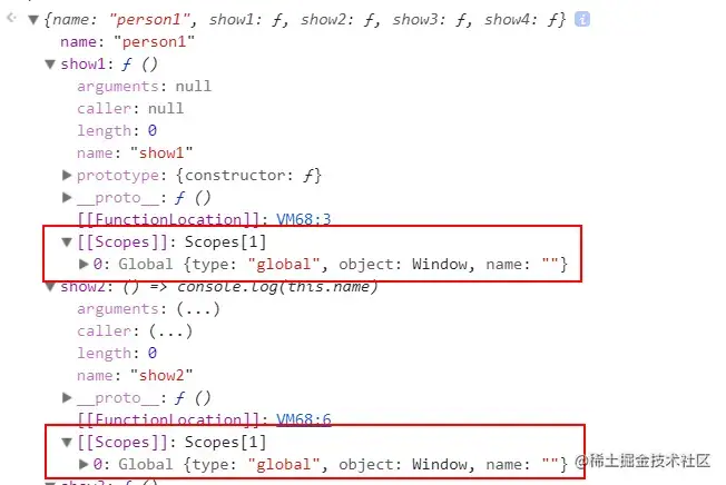 我们发现与之前字面量声明的相比,show2方法的输出产生了不一样的结果。为什么呢?虽然说构造方法Person是有自己的函数作用域。但是对于personA来说,它只是一个对象,在直观感受上,它跟第一道题中的person1应该是一模一样的。 JSON.stringify(new Person('person1')) === JSON.stringify(person1)也证明了这一点。