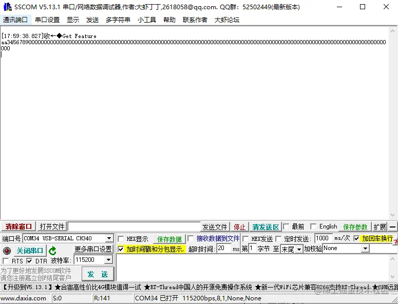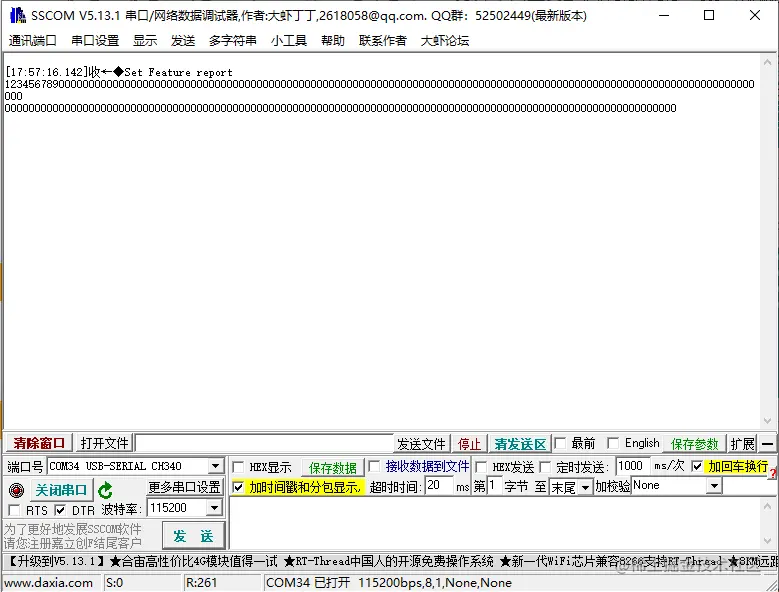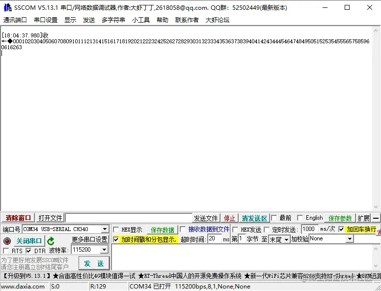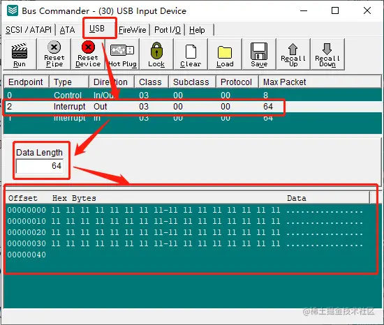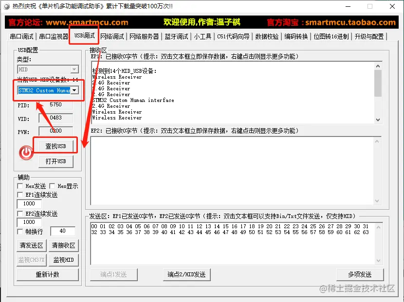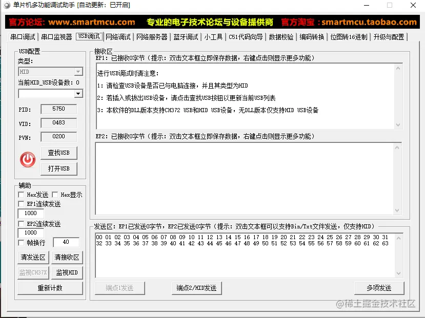 然后点击打开USB,勾选Hex显示,检测收发数据,可以看到开发板向计算机发送的数据,长度为64字节: