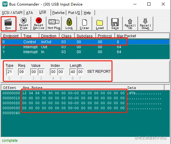 64,即需要发送64个字节;修改下方的数据为想要发送的数据,这里为便于观察,设置成全0x11,然后点击Run发送。