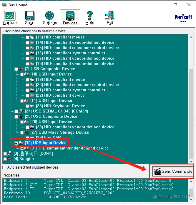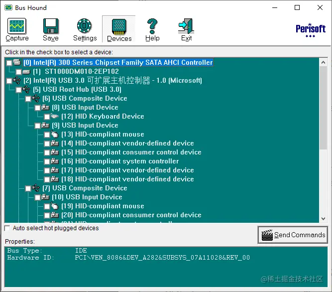 Bus Hound 打开Bus Hound,在Devices页面找到我们的HID设备,注意VID和PID与我们设置的一致,勾选该设备: