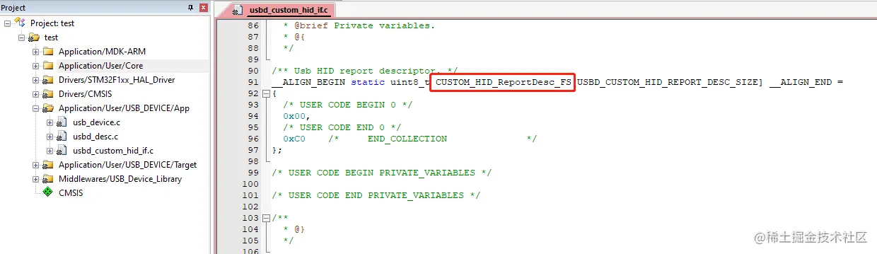 找到CUSTOM_HID_ReportDesc_FS数组定义处。