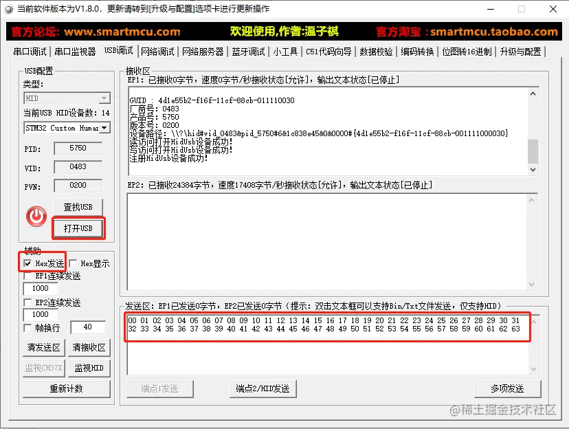 点击打开USB,勾选Hex发送,修改下方的数据为想要发送的数据: