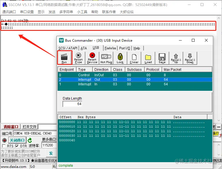 然后切换到Capture页面,点击Run,检测收发数据,可以看到开发板向计算机发送的数据,长度为64字节: