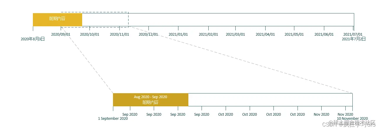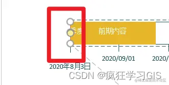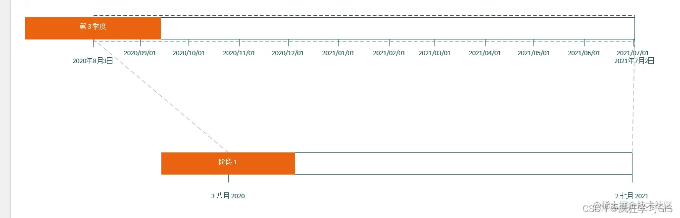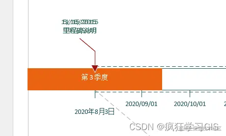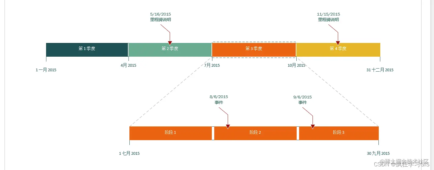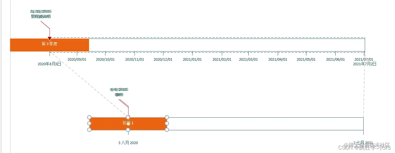 可以看到,一些原本在时间轴中分散分布的元素(例如上图中第3季度、阶段1,这些元素叫做“时间间隔”),此时都聚集在了一起。这是由于这些元素是适合于模板中原来的时间范围的,而我们刚刚修改了这一时间范围,从而导致部分元素可能出现聚集的情况。