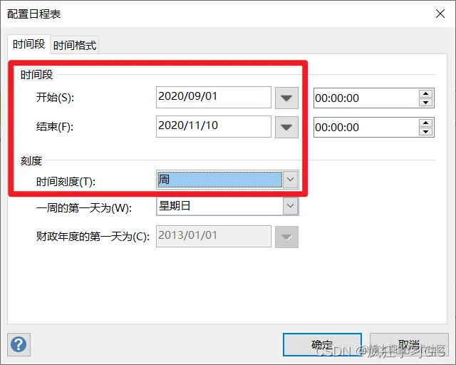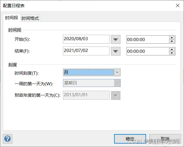 在弹出的窗口中,我们可以在“时间段”一栏中配置时间轴的开始、结束时间,以及时间轴上每一个刻度的大小。