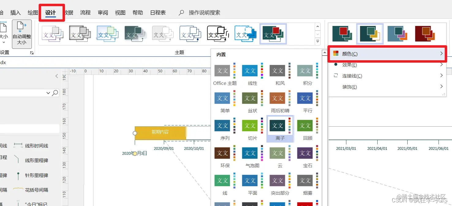 如果我们想要调整整个时间轴的配色,可以在“设计”中选择“颜色”,从而选择合适的配色方案。