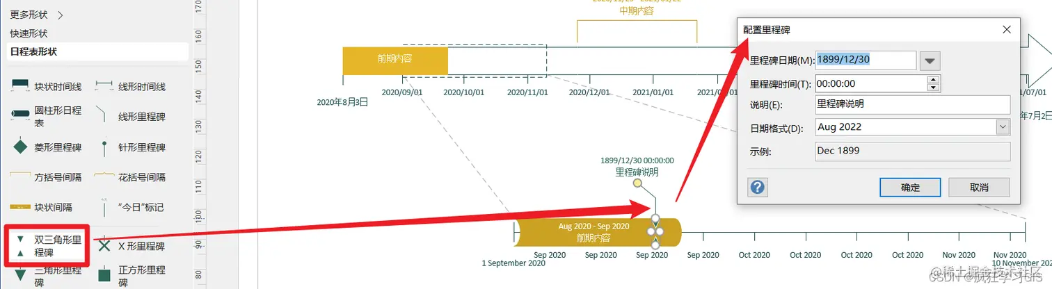 接下来,我们可以在时间轴中添加“里程碑”。例如,在左侧“形状”列表中选择“双三角形里程碑”,然后添加到时间轴中,并配置其时间点。