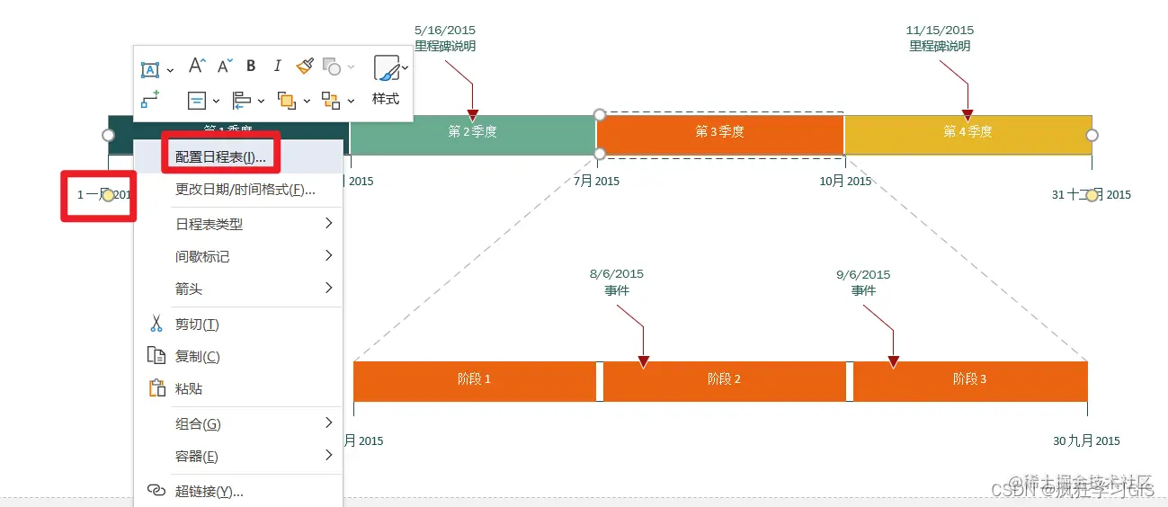 其中,不难看到上方的时间轴为总时间轴,下方的时间轴为附属的时间轴。我们首先要做的是将原本模板里时间轴的时间范围修改为我们需要的时间范围。在时间轴任意一处(如下图中左侧的红色矩形处)右键,选择“配置日程表”。