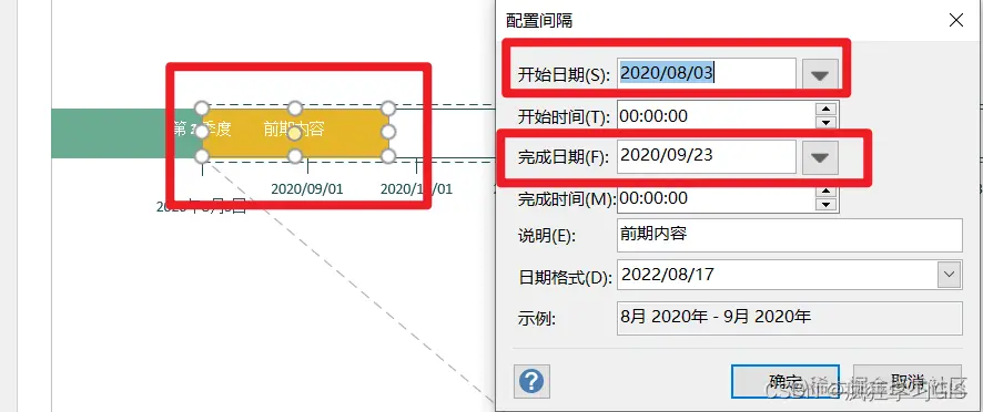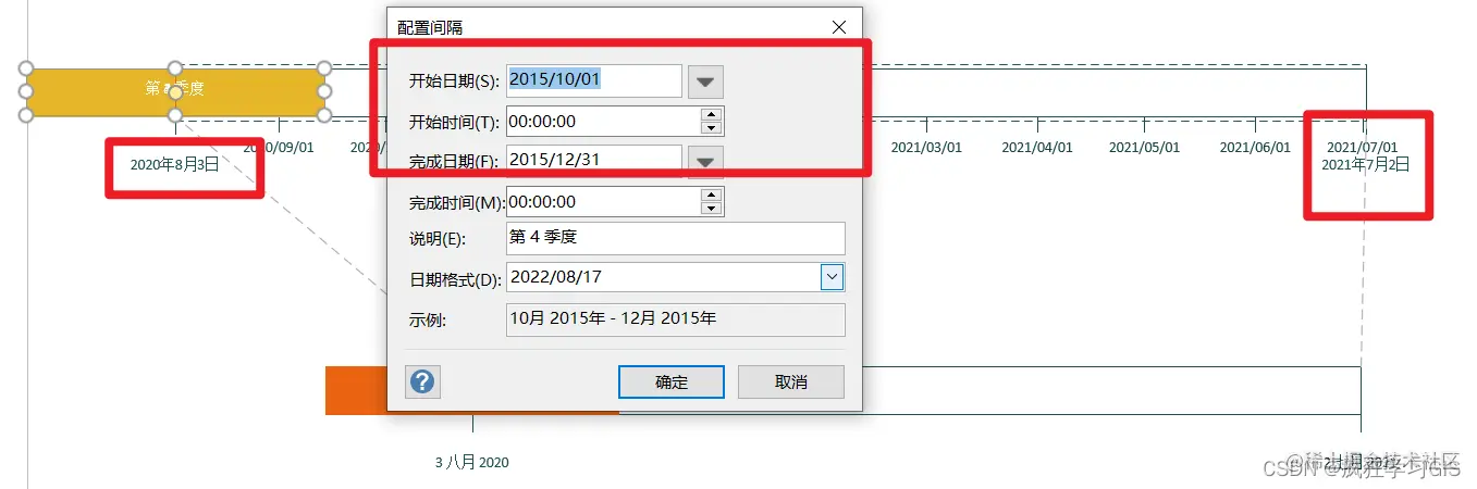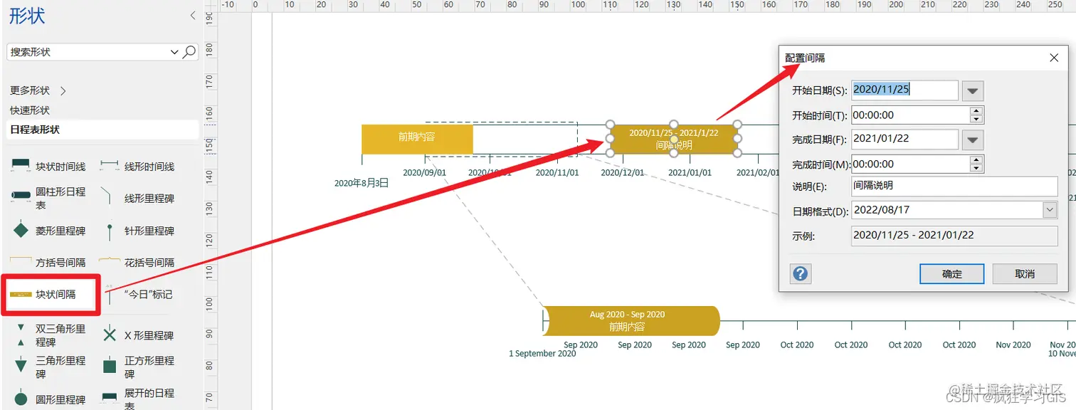 如果我们需要引入新的时间间隔元素,可以在左侧“形状”列表中选择“块状间隔”,然后添加到时间轴中 ,并配置其具体的时间范围。