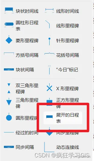 最后,如果我们想为一个总时间轴设置多个附属时间轴,或者为某一个附属时间轴设置二级附属时间轴,都可以从左侧“形状”列表中选择“展开的日程表”。