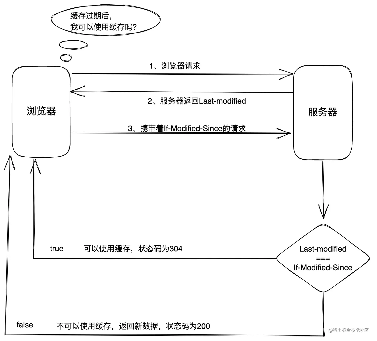 If-Modified-Since 字段,值就是Last-Modified,服务器接收到后就会去比对两个值是否相等,若相等则返回304告诉浏览器可以使用缓存,若不相等,则返回新的资源,状态码为200。