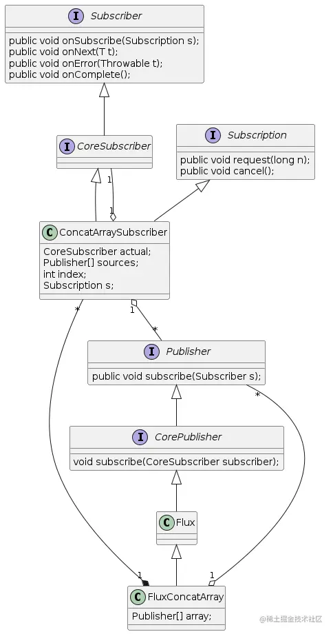 为了充分利用数组长度固定,易于遍历的特点,Project Reactor引入了FluxConcatArray和ConcatArraySubscriber来支持该场景。其类图如下