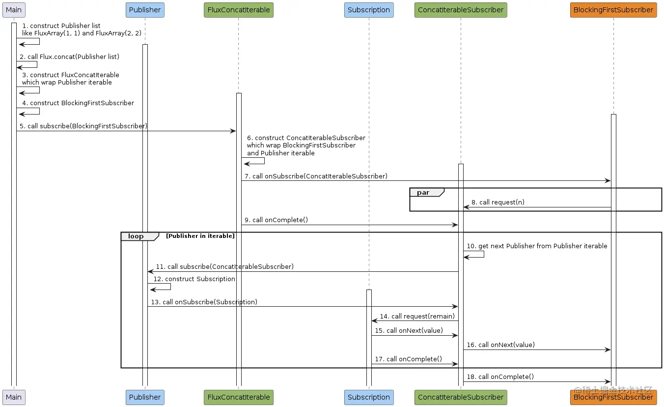 FluxConcatIterable.subscribe(BlockingFirstSubscriber)订阅FluxConcatIterable。 FluxConcatIterable创建ConcatIterableSubscriber实例,它包含了BlockingFirstSubscriber和Publisher列表。FluxConcatIterable调用BlockingFirstSubscriber.onSubscribe(ConcatIterableSubscriber)来通知其订阅成功。BlockingFirstSubscriber调用ConcatIterableSubscriber.request(n)来请求固定大小的数据,该调用可发生多次且可在第7步后任何时间点发生。FluxConcatIterable调用ConcatIterableSubscriber.onComplete()来通知ConcatIterableSubscriber数据发布结束。大家可能注意到,这里ConcatIterableSubscriber并未请求任何数据却直接收到了onComplete。这样做的原因是ConcatIterableSubscriber已经拿到了Publisher列表,不需要再像flatMap中的FlatMapMain那样等待数据发布。ConcatIterableSubscriber从Publisher列表中获取一个Publihser。ConcatIterableSubscriber调用Publisher.subscribe(ConcatIterableSubscriber)来订阅该Publisher。Publisher创建Subscription实例。Publisher调用ConcatIterableSubscriber.onSubscribe(Subscription)来通知ConcatIterableSubscriber订阅成功。ConcatIterableSubscriber调用Subscription.request(remain)来请求数据,其大小为BlockingFirstSubscriber请求大小减去已发布数据大小。Subscription调用ConcatIterableSubscriber.onNext(value)来向ConcatIterableSubscriber发布数据,该调用可发生多次。ConcatIterableSubscriber调用BlockingFirstSubscriber.onNext(value)来向BlockingFirstSubscriber发布数据。- 在数据发布结束时,