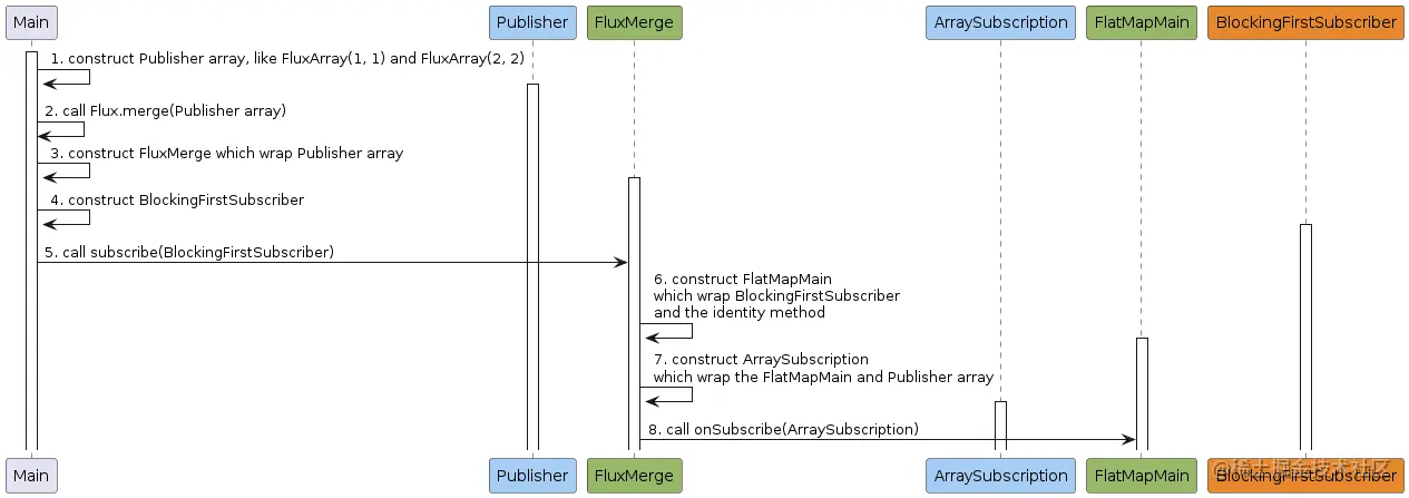 FluxMerge.subscribe(BlockingFirstSubscriber)订阅FluxMerge。 FluxMerge创建FlatMapMain实例,它包含了BlockingFirstSubscriber和转换函数f, 这里f是identity函数,该函数会原样返回输入值。FluxMerge创建ArraySubscription实例,它包含了FlatMapMain和Publisher数组。FluxMerge调用FlatMapMain.onSubscribe(ArraySubscription)来通知FlatMapMain订阅成功。注意,这里FlatMapMain并不需要发起订阅请求。