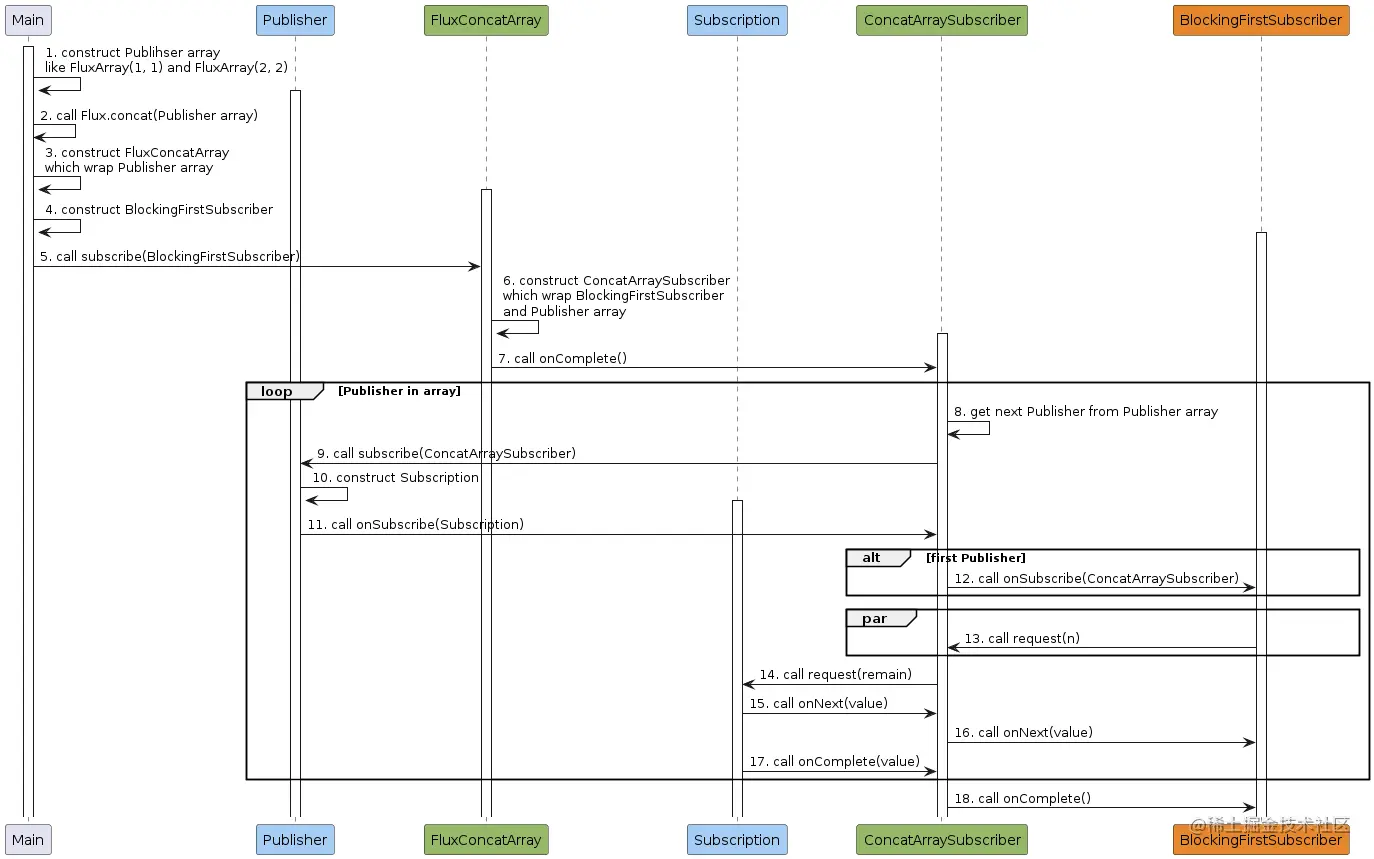Publisher是数组中的第一个Publisher,ConcatArraySubscriber调用BlockingFirstSubscriber.onSubscribe(ConcatArraySubscriber)来通知其订阅成功。 BlockingFirstSubscriber调用ConcatArraySubscriber.request(n)来请求固定大小的数据,该调用可发生多次且可在第12步后任何时间点发生。ConcatArraySubscriber调用Subscription.request(remain)来请求数据,其大小为BlockingFirstSubscriber请求大小减去已发布数据大小。Subscription调用ConcatArraySubscriber.onNext(value)来向ConcatArraySubscriber发布数据,该调用可发生多次。ConcatArraySubscriber调用BlockingFirstSubscriber.onNext(value)来向BlockingFirstSubscriber发布数据。- 在数据发布结束时,
