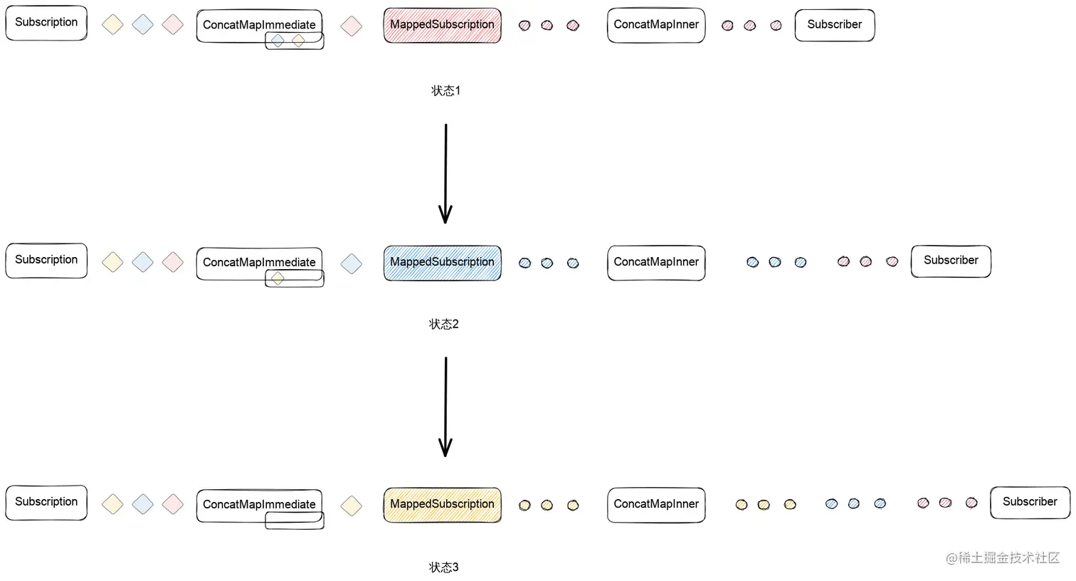 ConcatMapImmediate从数据队列中获取第一个元素,并生成对应的MappedSubscription。ConcatMapInner订阅该MappedSubscription并向Subscriber转发数据,直到数据发布结束。ConcatMapImmediate将第二个元素存储到它的数据队列中。ConcatMapImmediate将第三个元素存储到它的数据队列中。
