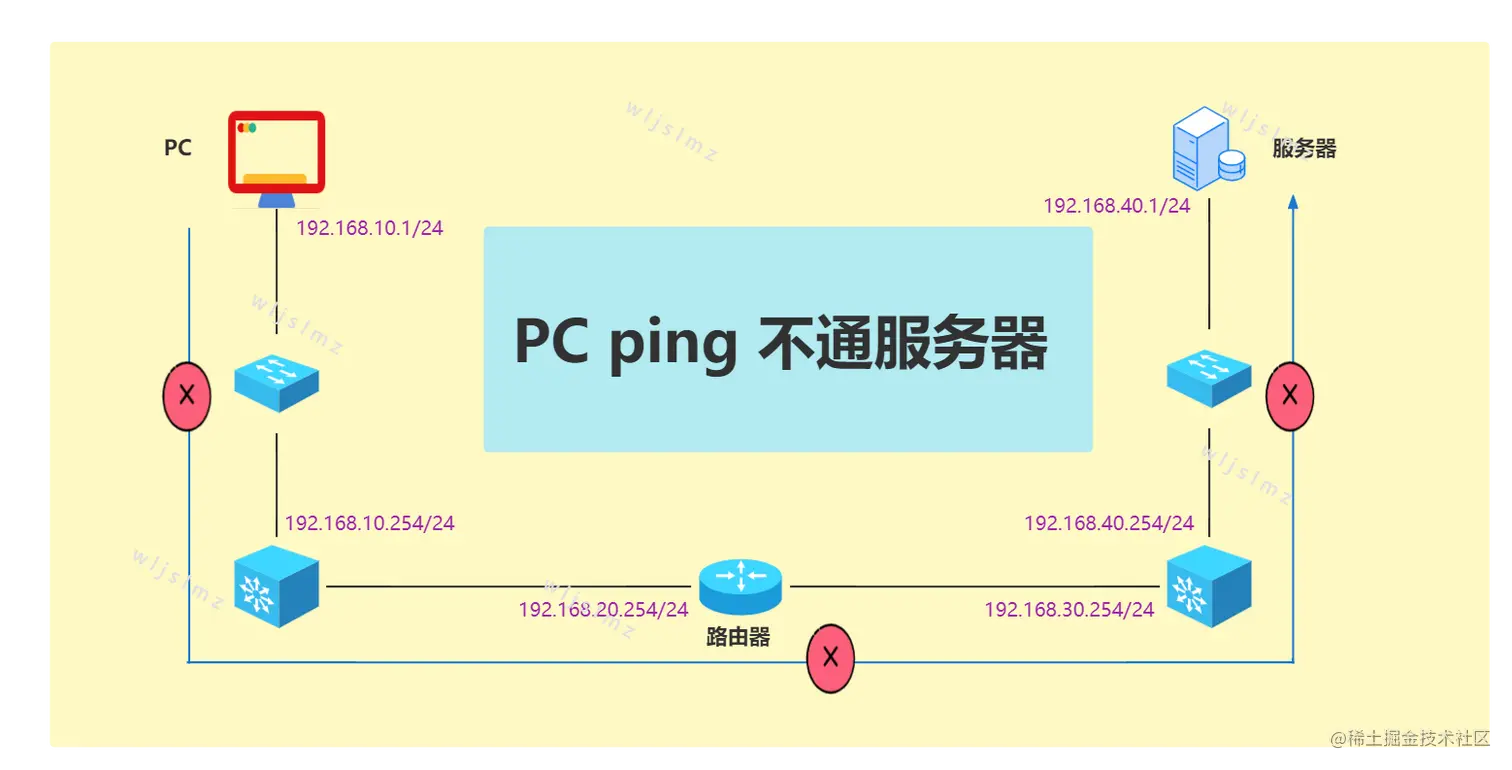 如下图,PC(192.168.10.1) ping 服务器(192.168.40.1)无响应。这种情况就属于ping不通的情况,此时我们应该怎么排查呢?本文瑞哥教你8个大招,轻松找到问题根源。