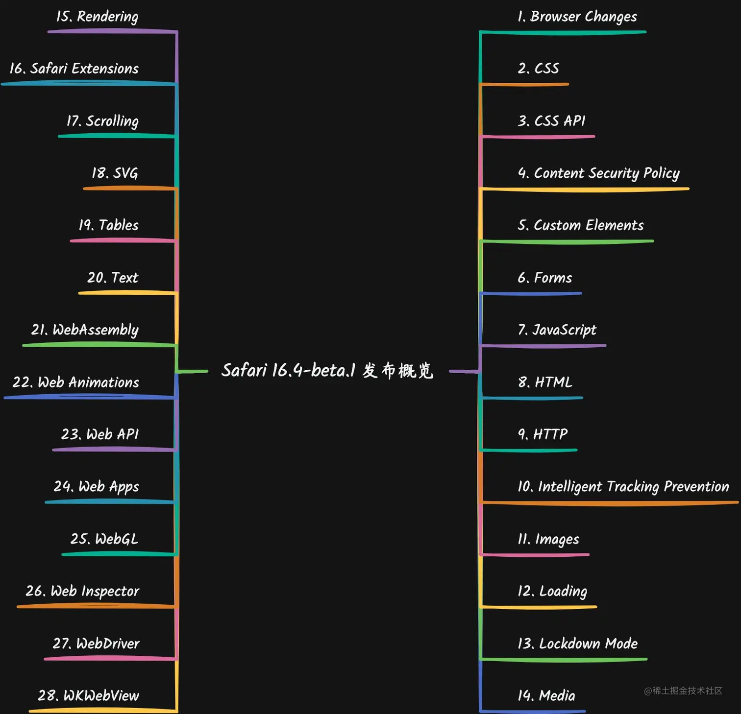 Safari 本次发布内容较多,下面简单列一下发布概览并借机学习下其产品迭代 Release Notes,然后挑几个 Web 开发同学相对可能更感兴趣的特性稍微展开一讲,可留意备用。