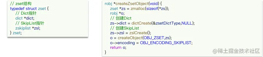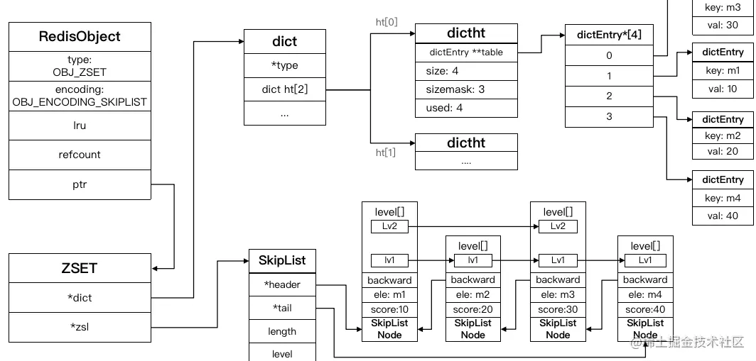 因此Zset采用SkipList和HT(Dict) 组合方式。数据结构如下