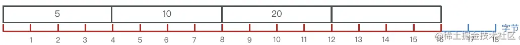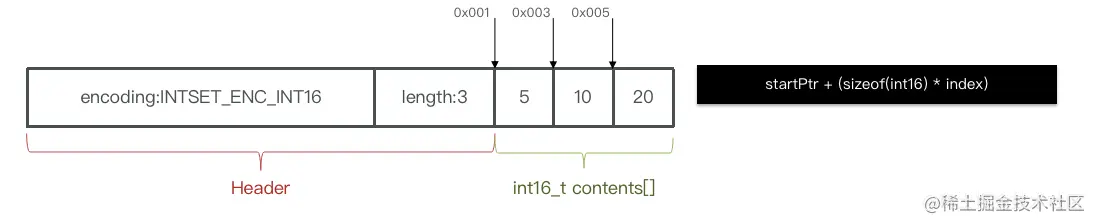 现在假设有一额intset,元素为{5,10,20}.采用的编码是INTSET_ENC_INT16,则每个整数占2字节: