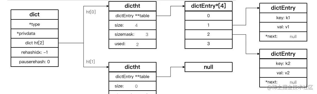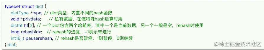 - Dict包含俩个哈希表,ht[0]平常用,ht[1]用来rehash
