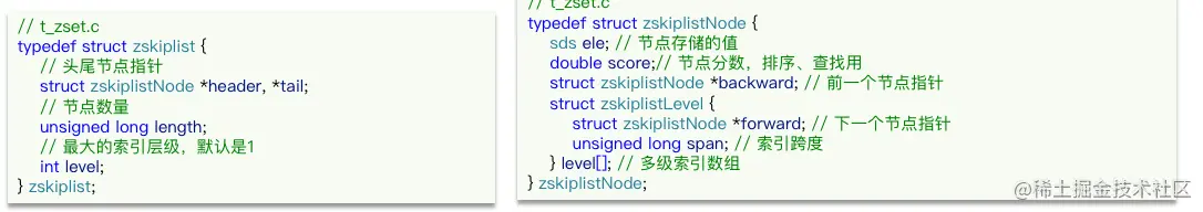 - 跳跃表是一个双向链表,每个节点都包含score和ele值