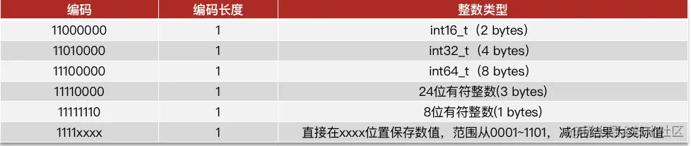 - 整数:如果encoding是以“11”开始,则证明content是整数,且encoding固定只占用1个字节