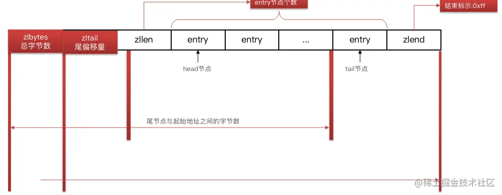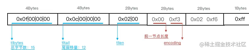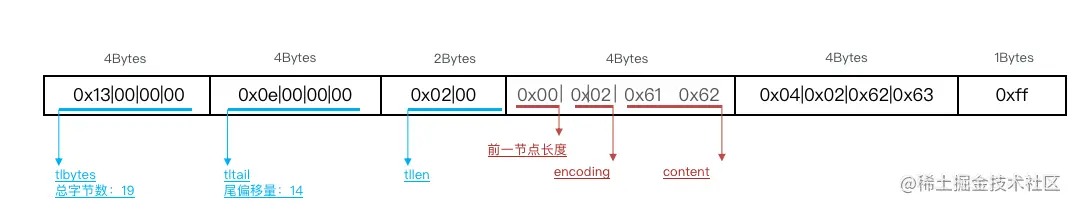 - 如果前一节点的长度大于254,则采用5个字节来保存这个长度值,第一个字节为0xfe,后四个字节才是真实长度数据