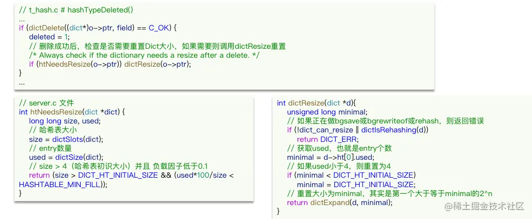 Dict除了扩容以外,每次删除元素时,也会对负载因子做检查,当LoadFactory<01时,会做哈希表收缩。