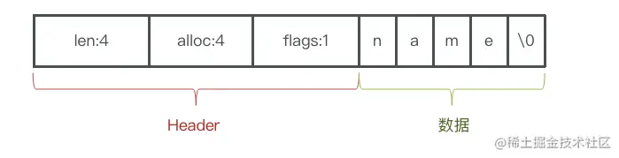 例如,一个包含字符串“name”的sds结构如下