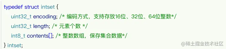 现在,数组中每个数字都在int16_t的范围内,因此采用的编码方式是INTSET_ENC_INT16,每部分占用的字节大小为:encoding:4字节length:4字节contents:2字节 * 3 = 6字节