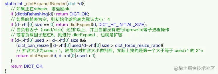 - 当LoadFactor大于5或者LoadFactor大于1并且没有子进程任务时,Dict扩容