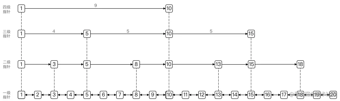 - 不同层指针到下一个节点的跨度不同,层级越高,跨度越大