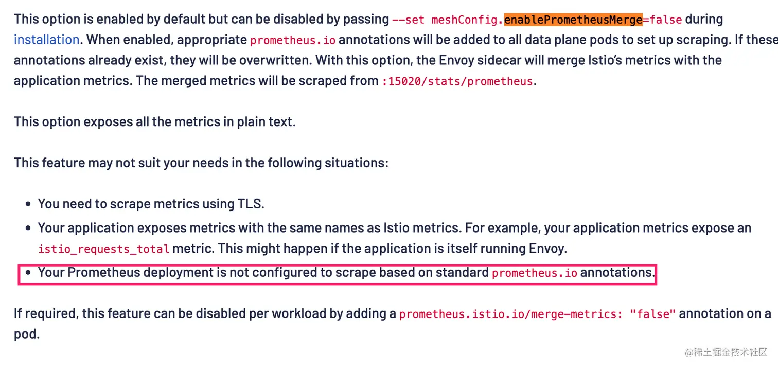 在控制面将 --set meshConfig.enablePrometheusMerge=false 设置为 false,其实官方文档已经说明,如果不是使用的标准 prometheus.io 注解,需要将这个设置为 false。