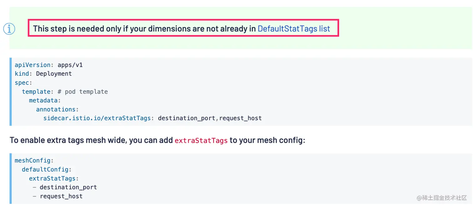 但这也有个大前提,当我们 tag 的指标没有在默认 tag 列表中时,需要在 Deployment 或者是 Istio 控制面中全局加入我们自定义的 tag 声明。
