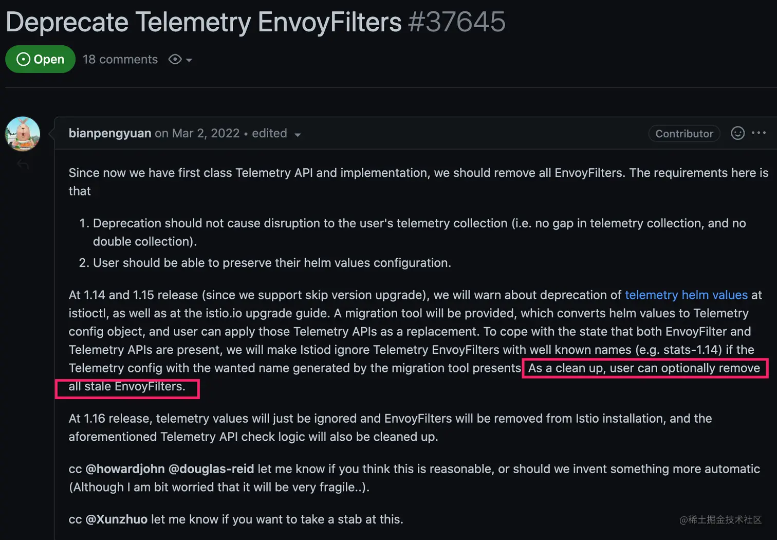 接着在我领导查看 Istio 源码以及相关 issue 后发现 Telemetry API 和 EnvoyFilter 是不能同时存在的,也就是说会优先使用 EnvoyFilter;这也就是为什么我之前配置没有生效的原因。