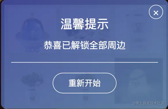 1、成功提示弹层上面增加了「重新开始」的按钮。