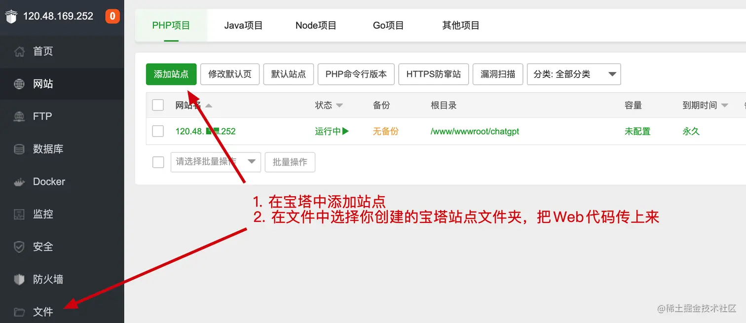 之后通过打开你的宝塔地址,创建站点和上传Web代码。