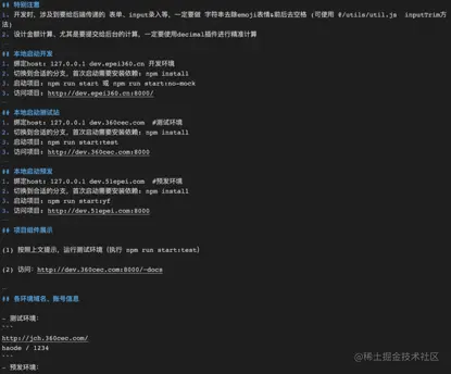 项目启动对于新入职员工,以及新人还是有一定的挑战的,特别是一些项目需要配置相关的host,package.json文件里面一般只是基础的启动,不会提示配置host等,此时就需要我们制定一个规范,比如在README.md文件下写上具体的启动步骤,以及每个环境需要配置的host,具体如下: