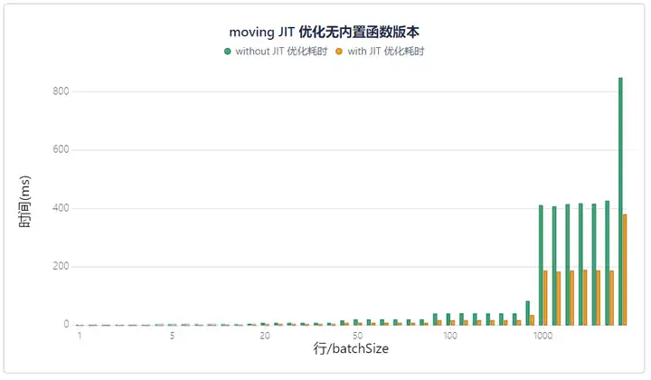 新版本中,JIT 除了新增支持常用函数 sum、avg、count、size、min、max、iif 等,还可帮助用户提升流数据引擎中特定函数以及自定义函数的性能。以 moving 函数为例,JIT 显著提升了响应式状态引擎的计算速度,优化效果十分明显。