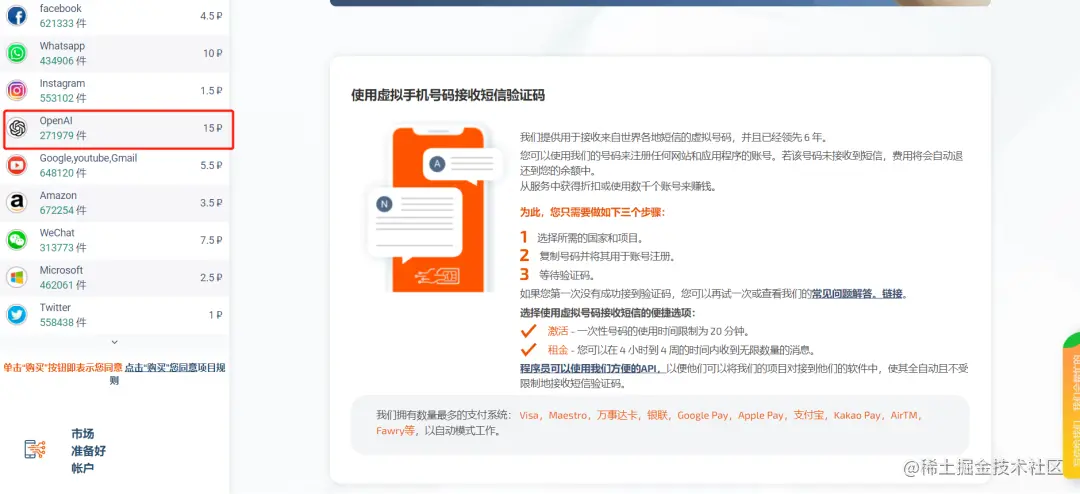 点击左边的OpenAI ,选择对应的国家,加入购物车,然后可以在激活区看到待使用的临时号码,将此号码复制到 OpenAI 的验证码接收区里面。最后点击发送验证码,这样就可以在接码平台接收到验证码,将验证码填进去,这样就完成注册了
