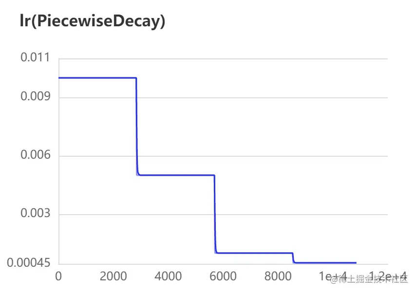 - 另外,可以直观地看到学习率采用PiecewiseDecay方式衰减的变化趋势。