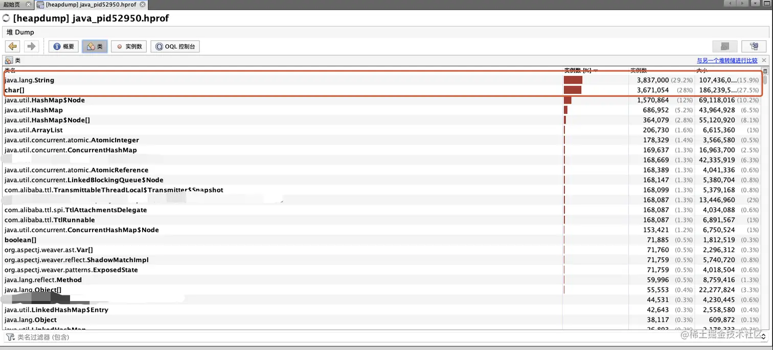 - 可以看到String和char []两个对象占据内存的Top2.