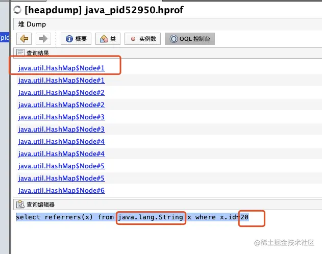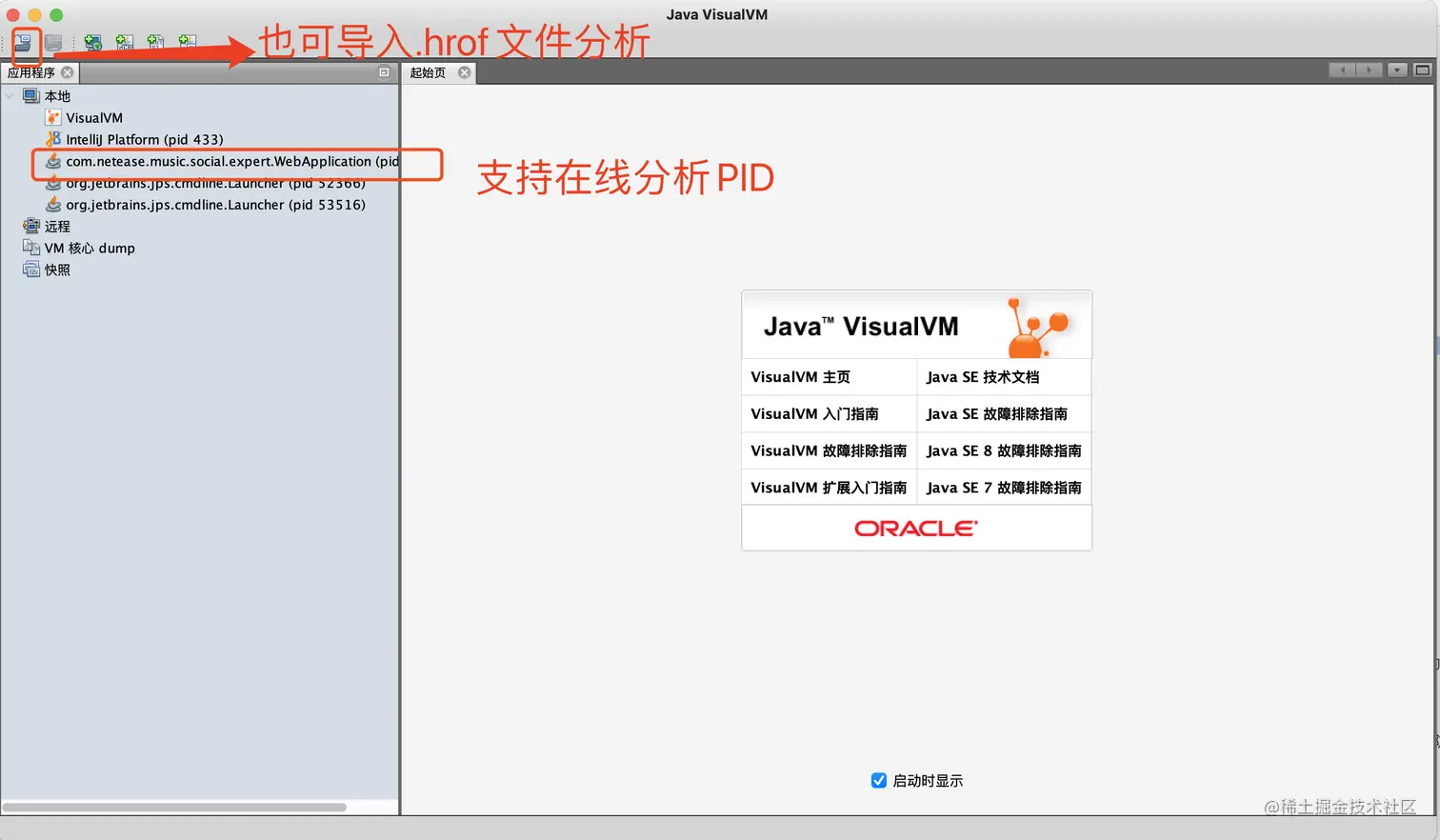 // dump日志后,会得到java_pid52950.hrof文件 $ jdump -F jump:format=b,file=heapDump 52950- 3.dump文件分析,本打算使用jhat命令来分析一番,结果半天没啥反应。于是只能使用java自带的分析神器VisualVM(当然也可以使用MAT),打开命令如下: