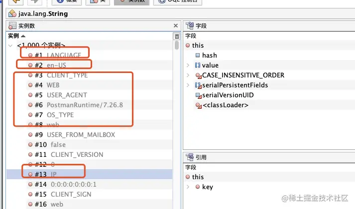 - 于是点开String和char[]对象,来看看里面都是些啥?看到langue、en-US、IP是不是很熟悉,有点类似我们的http请求头的数据结构。