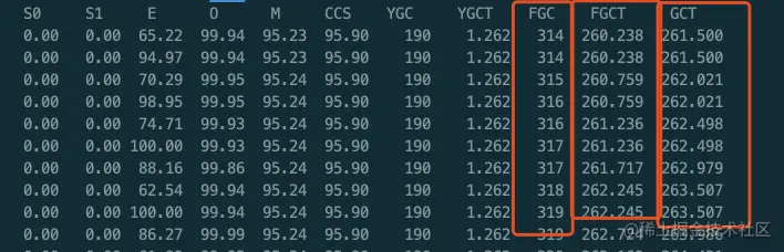 // 查看机器CPU运行情况,其中PID=52950为当前java运行线程PID $ top -n 5// 或查看java线程内存使用情况 $ jstat -gcutil 52950 1000 ##其中 52950为PID,1000为刷新间隔(1s)- 从上图可知,full gc的次数多达300+次,而且中的full gc时间也曾高达200+s,所以肯定是发生了内存泄漏,导致full gc超限,引发的OOM。