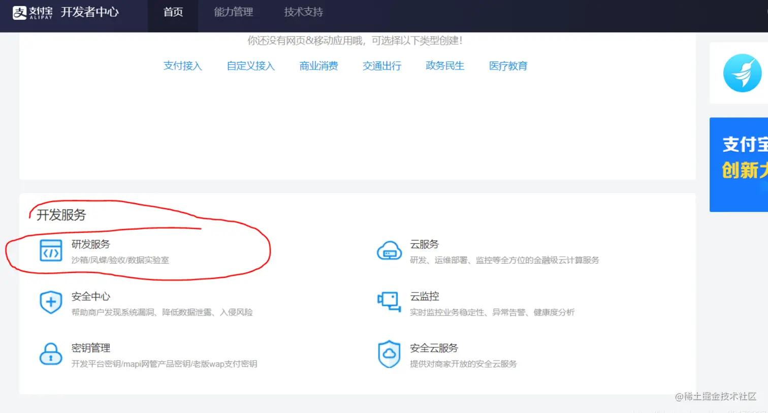 进入开发者中心后,下面有一个开发服务下的研发服务。