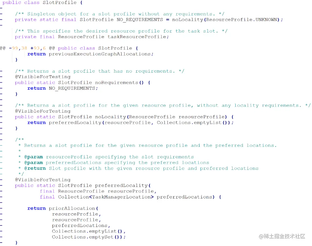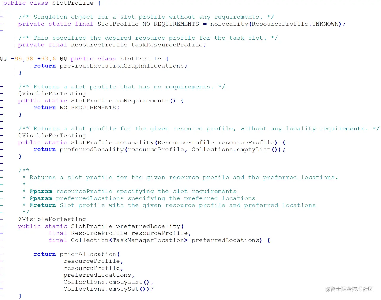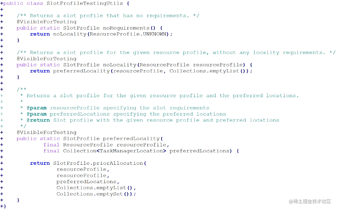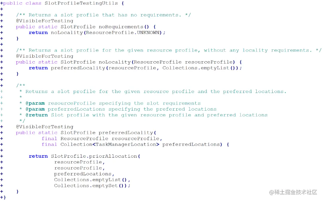 以开源流处理框架Apache Flink中的某个提交“44fc8c”为例,其部分代码变更片段如图10.8.4所示,移动了类SlotProfile中的一些函数,并将其提炼到类SlotProfileTestingUtils中,如图10.8.5所示。