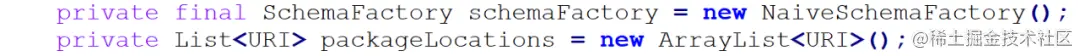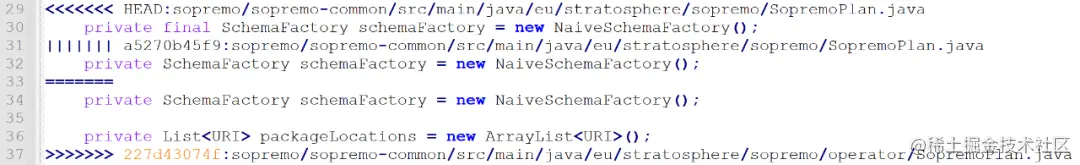 针对图10.8.8中的冲突块,经过代码语义理解后的代码变更行为为Ours基于Base/Theirs单方增加了变量schemaFactory的修饰符final,Theirs基于Base/Ours单方增加了变量packageLocations定义的语句,故最终将合并两个行为的变更。其消解结果如图10.8.11所示: