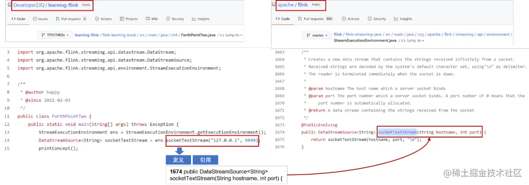图的左边是DeveloperZJQ/learning-flink仓在14行调用了右边apache/flink仓StreamExecution Environment类中的函数:publicDataStreamSourcesocketTextStream(Stringhostname, intport)。当鼠标放置在socketTextStream函数时,会自动检索后台预先建立的引用、定义索引,点击弹出的定义片段即可快速跳转到该函数定义的位置。